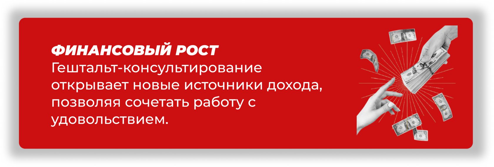 Инвестиция в обучение становится фундаментом для стабильного дохода в будущем. Освоив профессию гештальт-консультанта, вы сможете привлекать больше клиентов, получать удовольствие от работы и обеспечивать финансовую стабильность через частную практику.