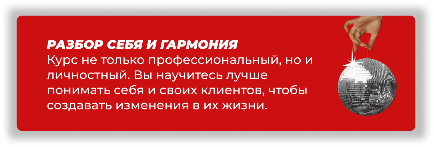 Процесс обучения включает не только профессиональные аспекты, но и личностное развитие. Вы научитесь находить баланс между внутренними переживаниями и профессиональными задачами, а также сможете использовать этот опыт, чтобы качественно помогать своим клиентам.