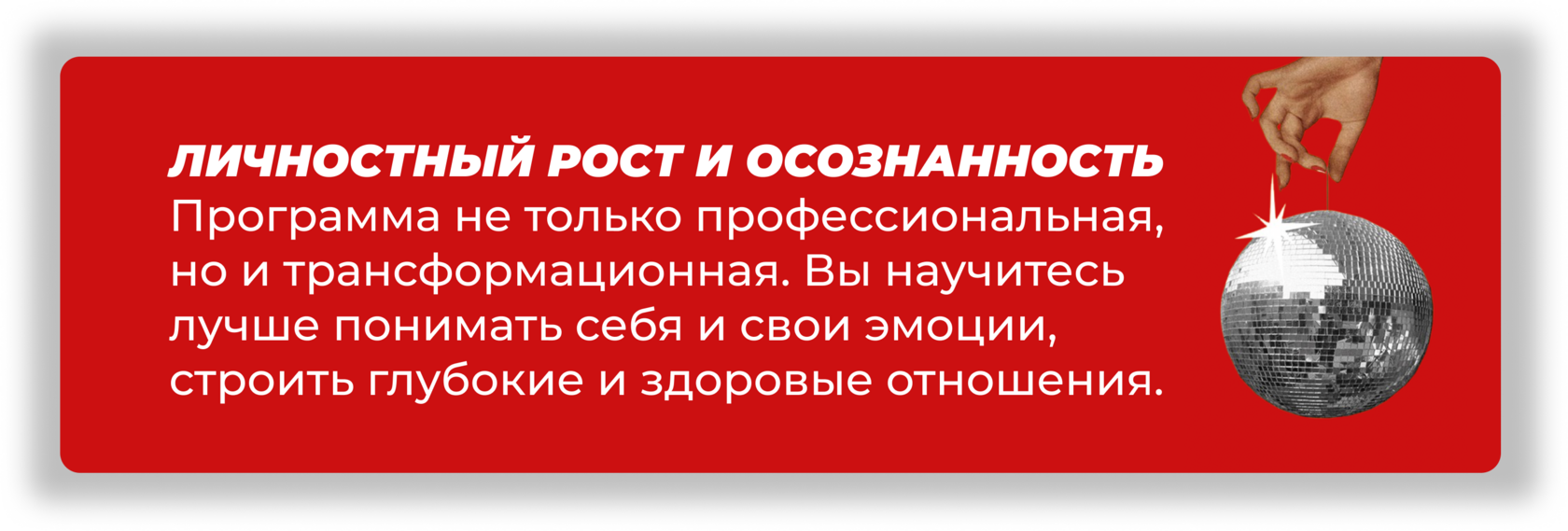 Обязательно часть всех программ Pogodin Academy. Поскольку обучение психологии не заканчивается за порогом академии. Практические задания и эксперименты, выполняемые в мини-группе, помогают отрабатывать навыки осознанности и эмпатии. Участники сменяются ролями, качественно прорабатывая имеющиеся проблемы.
